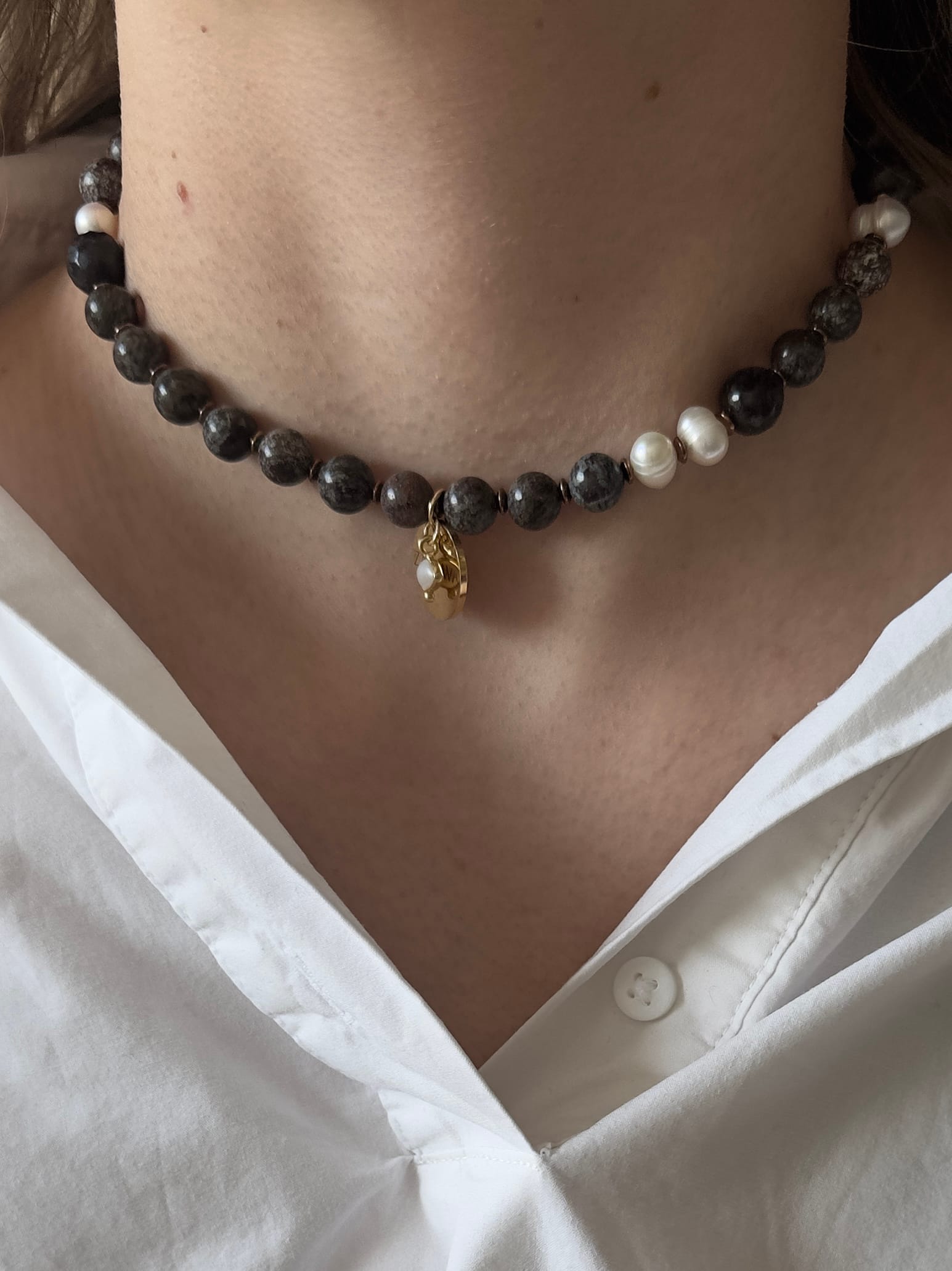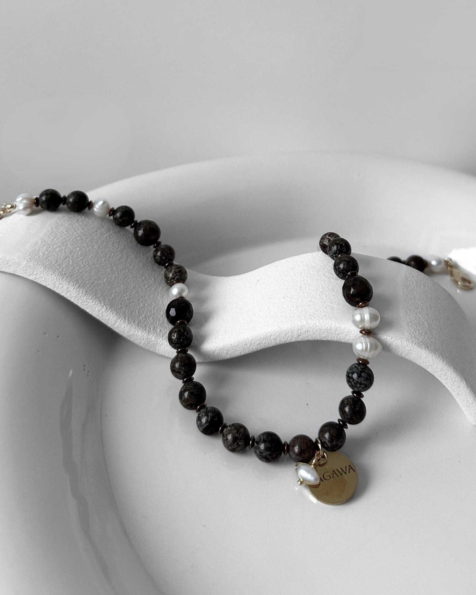 Naszyjnik BRUNO to elegancka kompozycja naturalnych pereł i kamieni w głębokich, brunatnych tonach. Jadeit, agat i hematyt w połączeniu z pozłacaną srebrną zawieszką z perłą tworzą wyrafinowany dodatek, który doskonale dopełnia stylizacje.