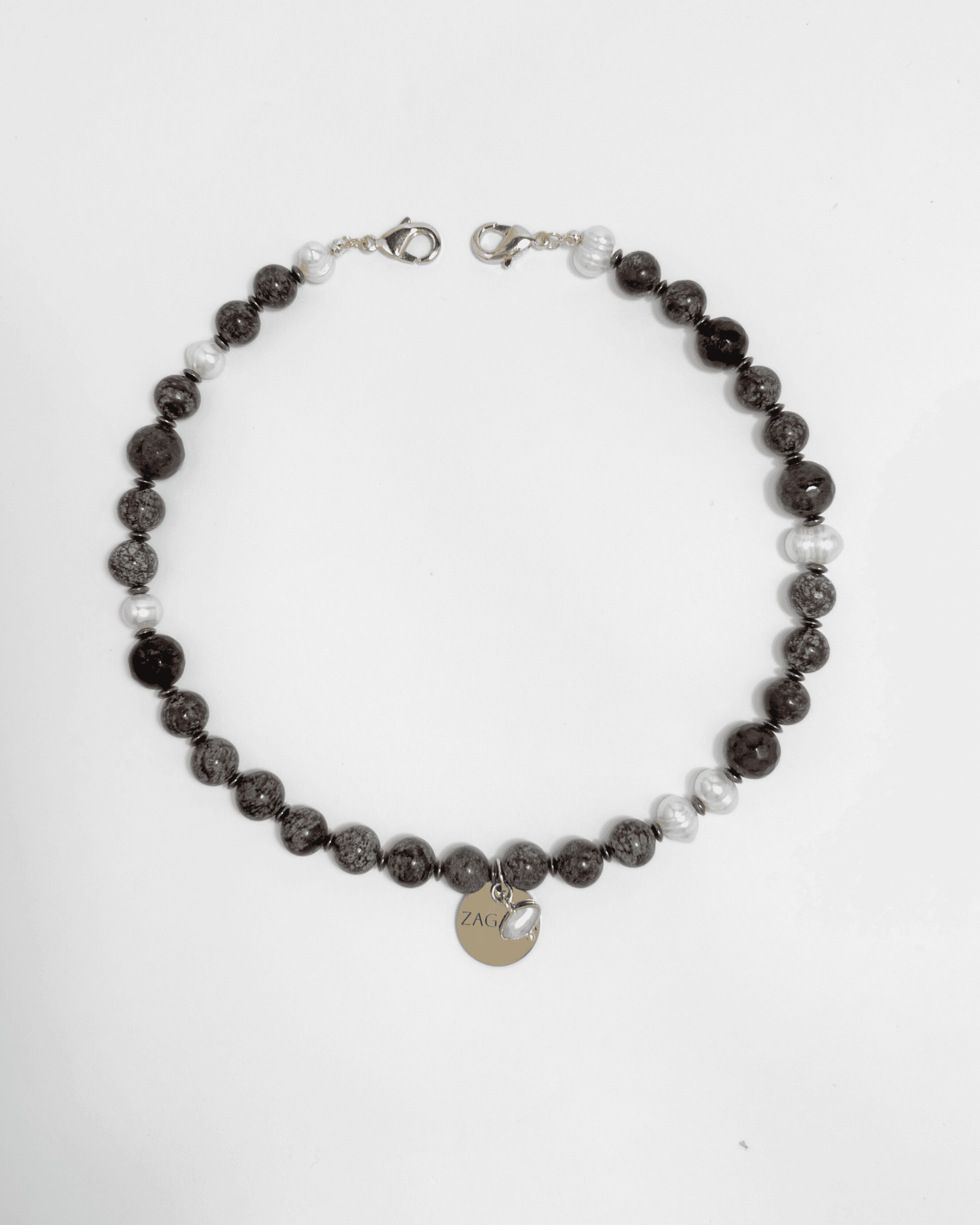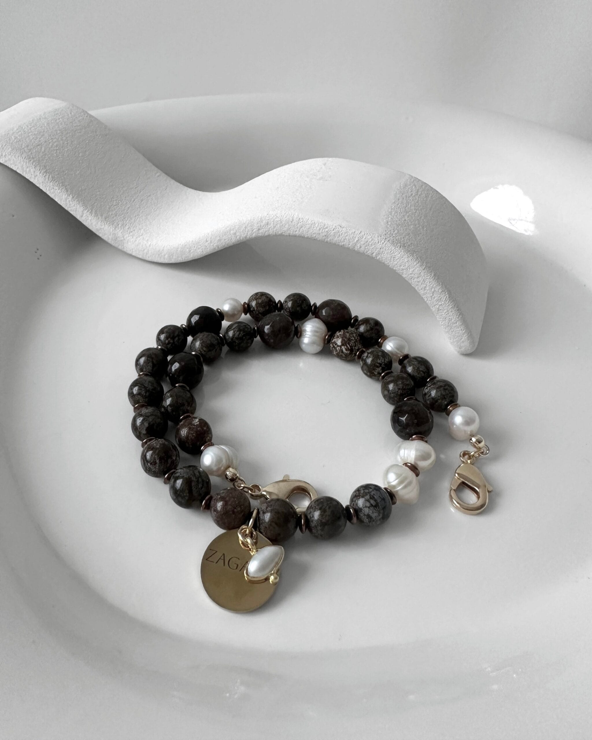 BRUNO to naszyjnik inspirowany naturalną paletą barw ziemi — ciepłymi brązami, grafitami i perłową bielą. Został wykonany z naturalnych pereł słodkowodnych, brunatnego jadeitu, agatu oraz brązowego hematytu w formie dysków, które nadają całości głębi i eleganckiego charakteru.