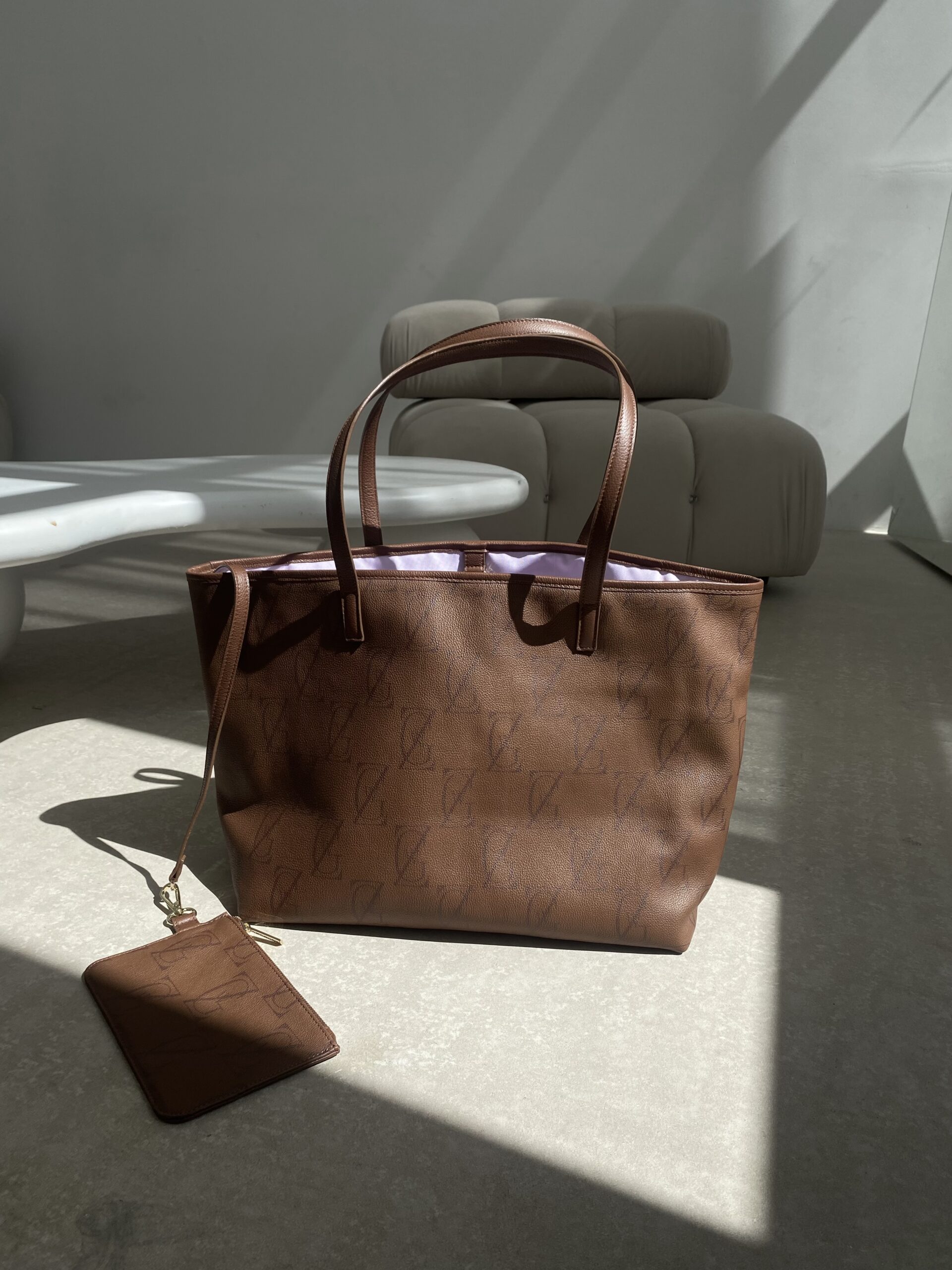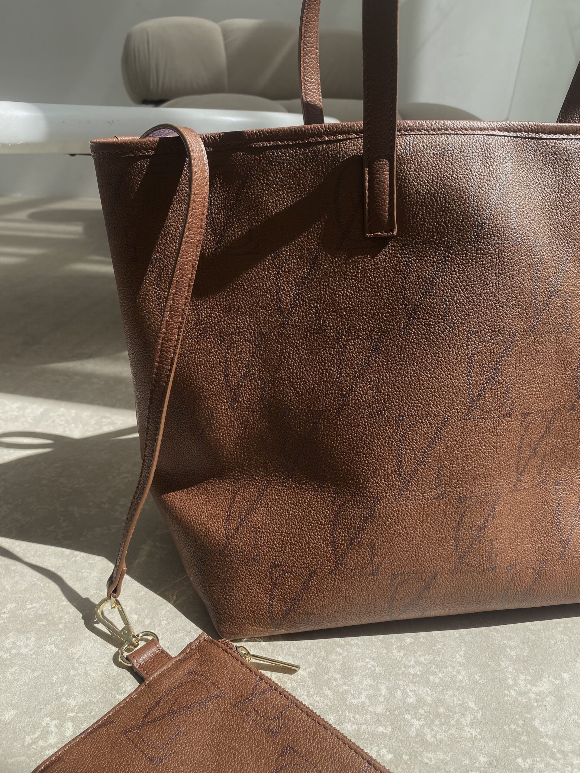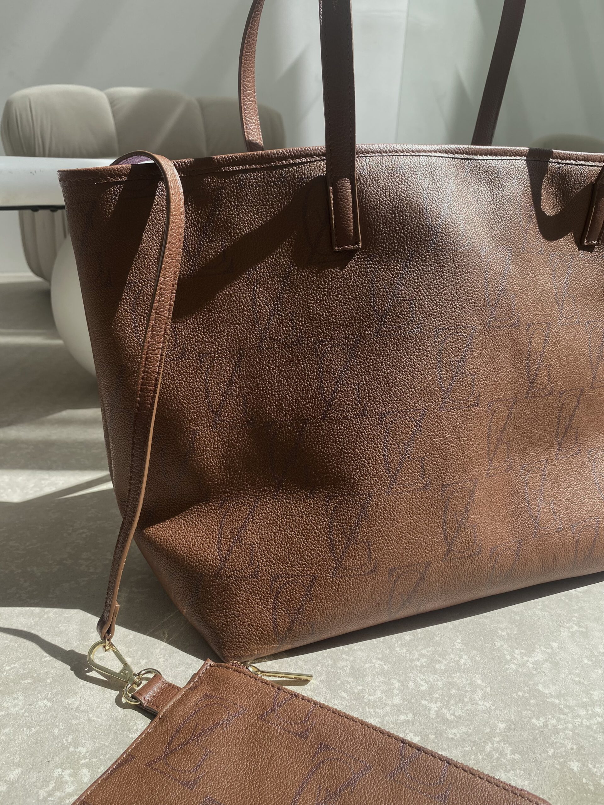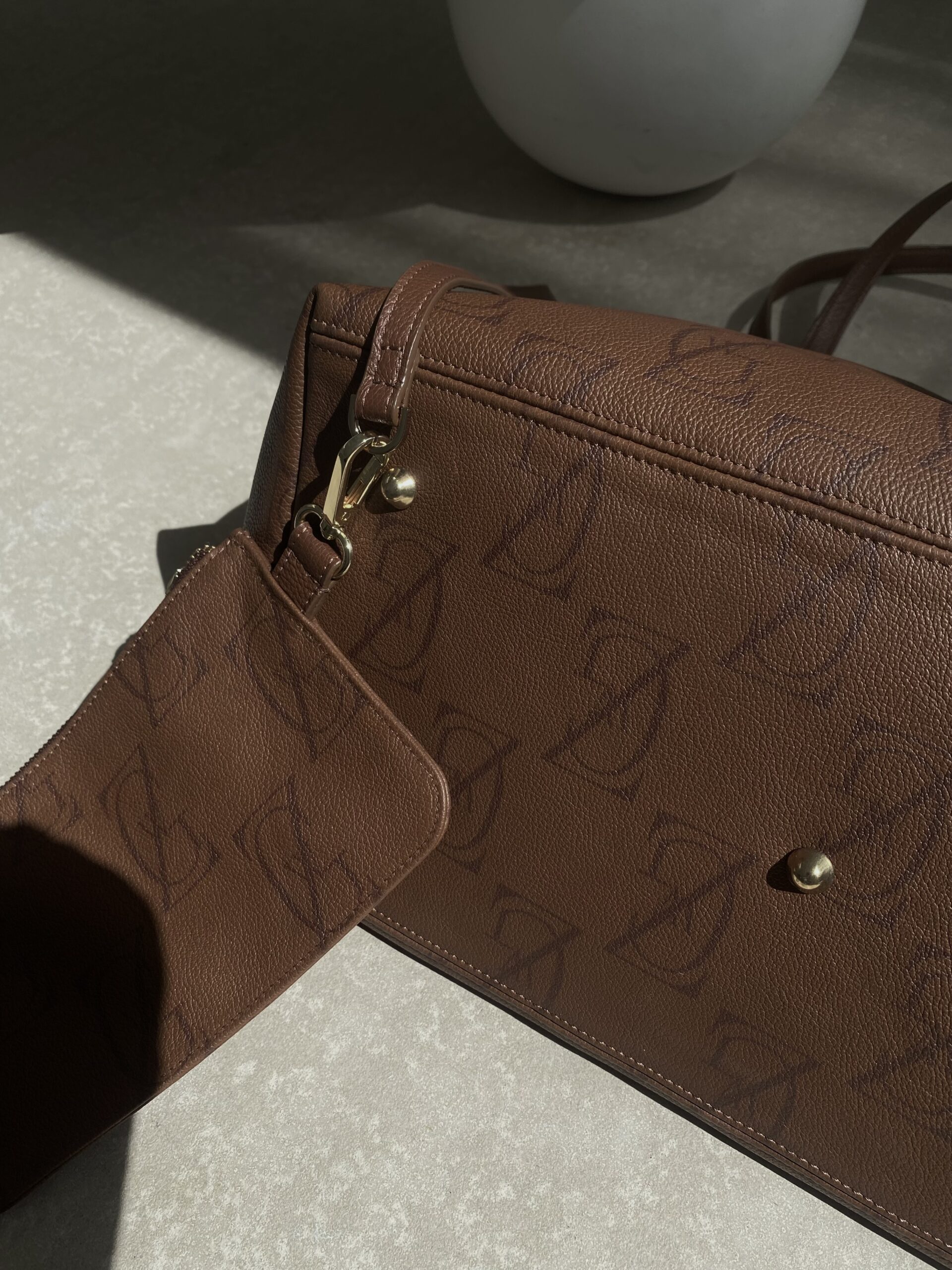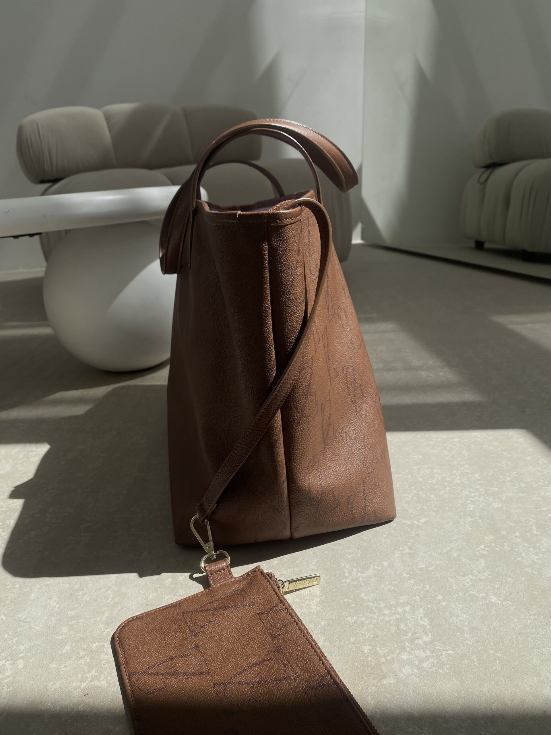 Duża, skórzana torba BRIA w eleganckim odcieniu brązu, dostępna w komplecie z dopasowaną kolorystycznie saszetką. Idealna na co dzień, łączy w sobie styl i funkcjonalność.