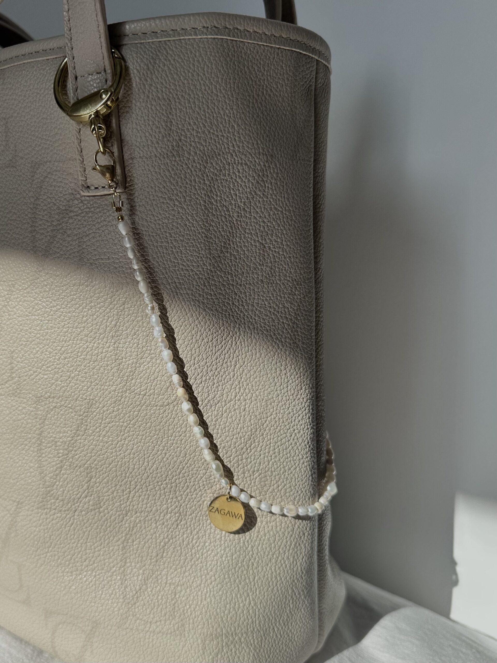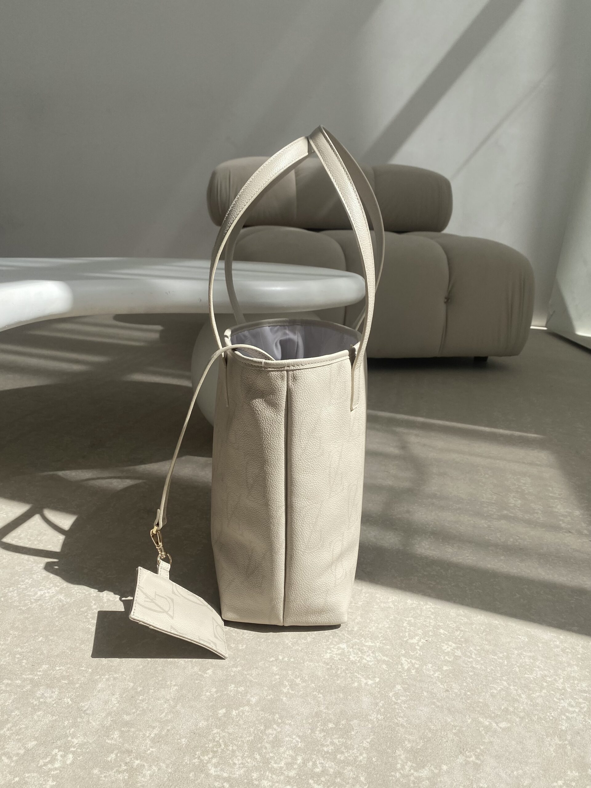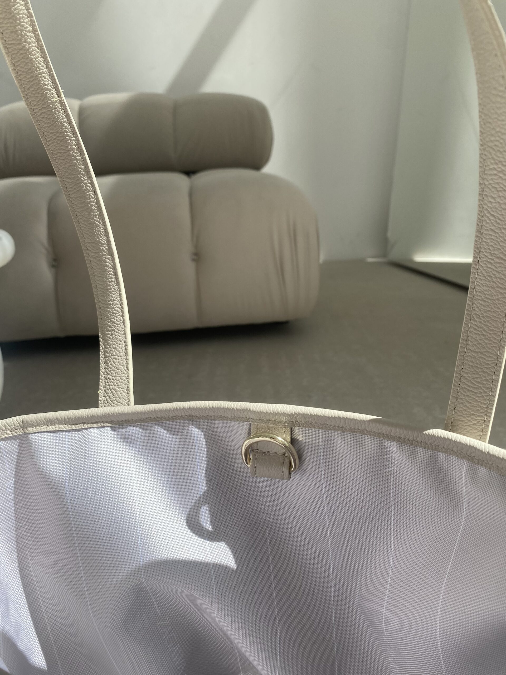 Wnętrze torby zostało wyłożone luksusową, wodoodporną podszewką z logotypem, chroniącą przed plamami i zabrudzeniami. Model wyposażony jest w dwie elastyczne rączki, które zapewniają komfort noszenia na ramieniu, oraz subtelne złote detale – w tym karabińczykowe zapięcie i stópki na spodzie, zabezpieczające torbę przed przetarciami. Jej powierzchnię zdobi autorski sygnet, naniesiony metodą precyzyjnego nadruku.