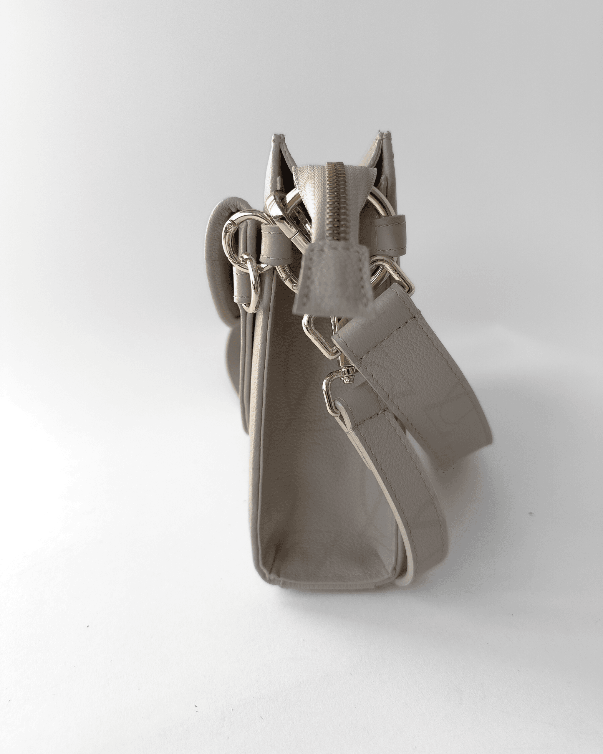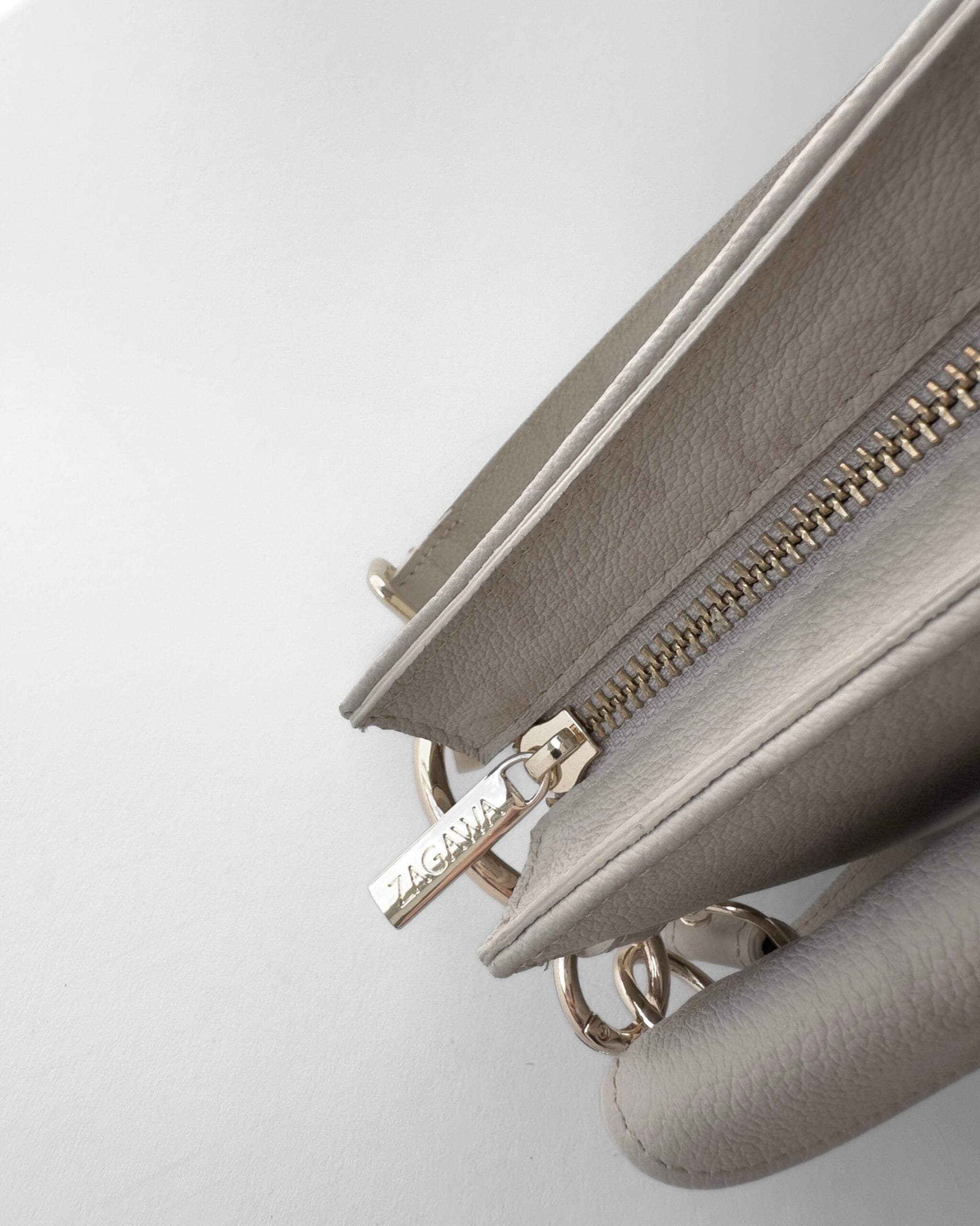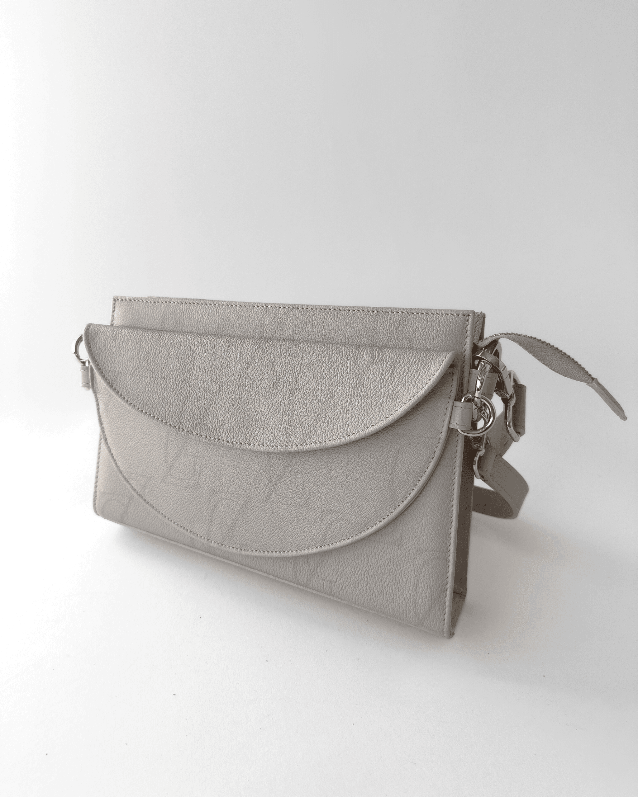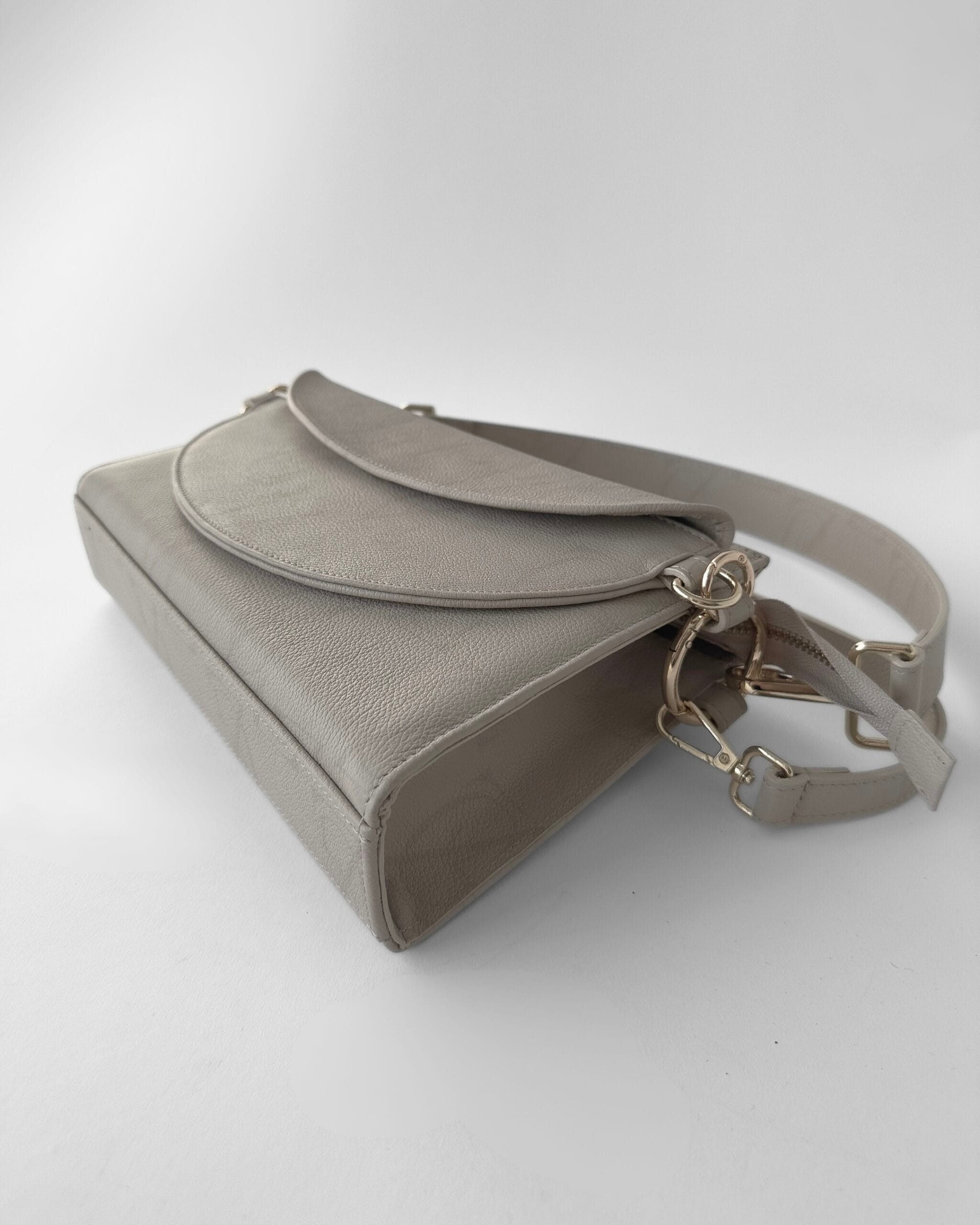 Mała, elegancka torebka z włoskiej skóry licowej, składająca się z dwóch dopinanych części TESSA ZIP i TESSA SNAP. Wyposażona w dwa paski – szeroki i wąski – oraz złote detale z grawerowanym suwakiem. Jej unikalnym elementem jest asymetryczne, skośne dno, które nadaje całości autorskiego charakteru.