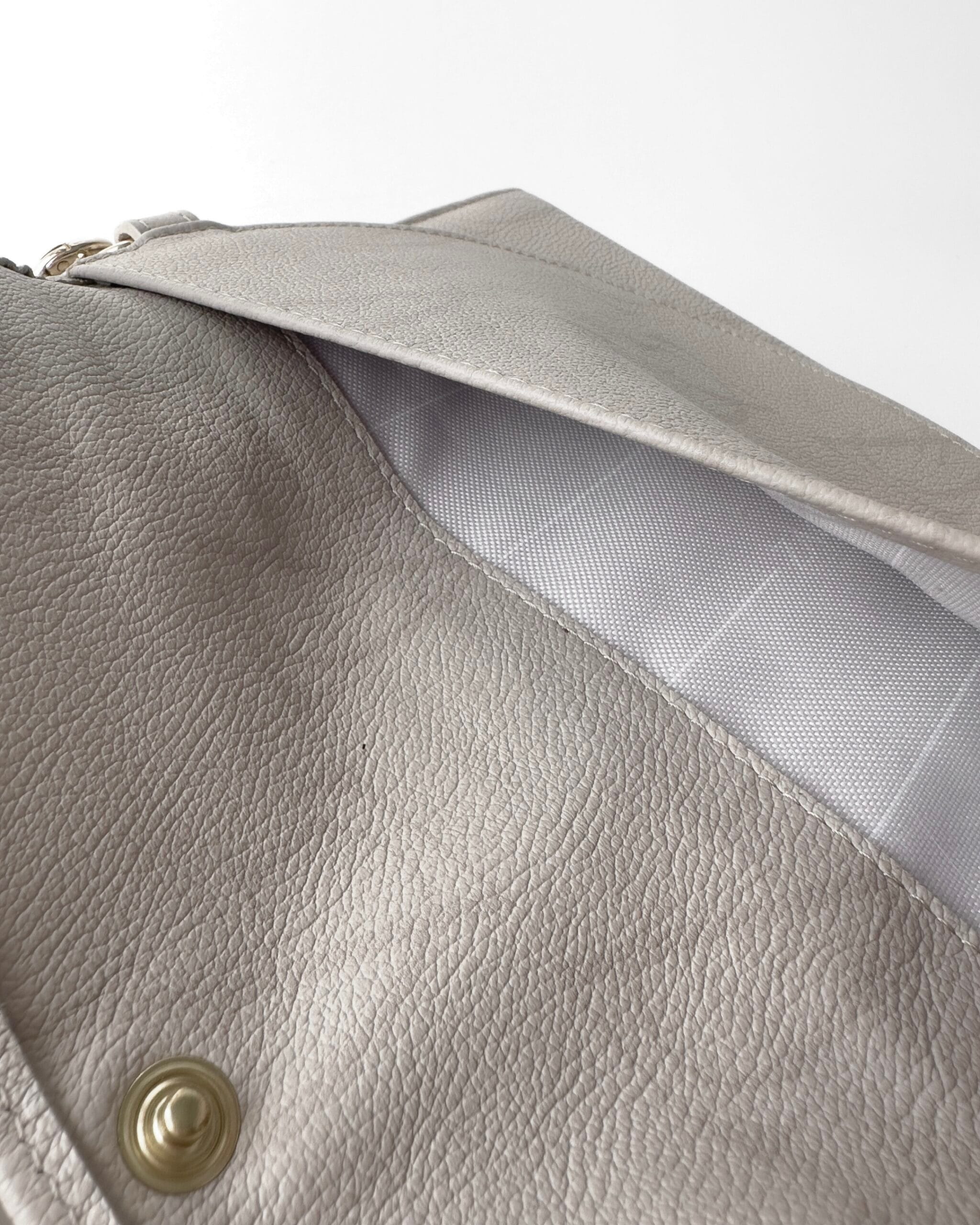 Wnętrze wykończone zostało luksusową, logowaną podszewką, odporną na zabrudzenia. Powierzchnię zdobi subtelny sygnet naniesiony na skórę, a złote elementy – w tym suwak z grawerowanym logo – dodają torebce wyrafinowanego charakteru.